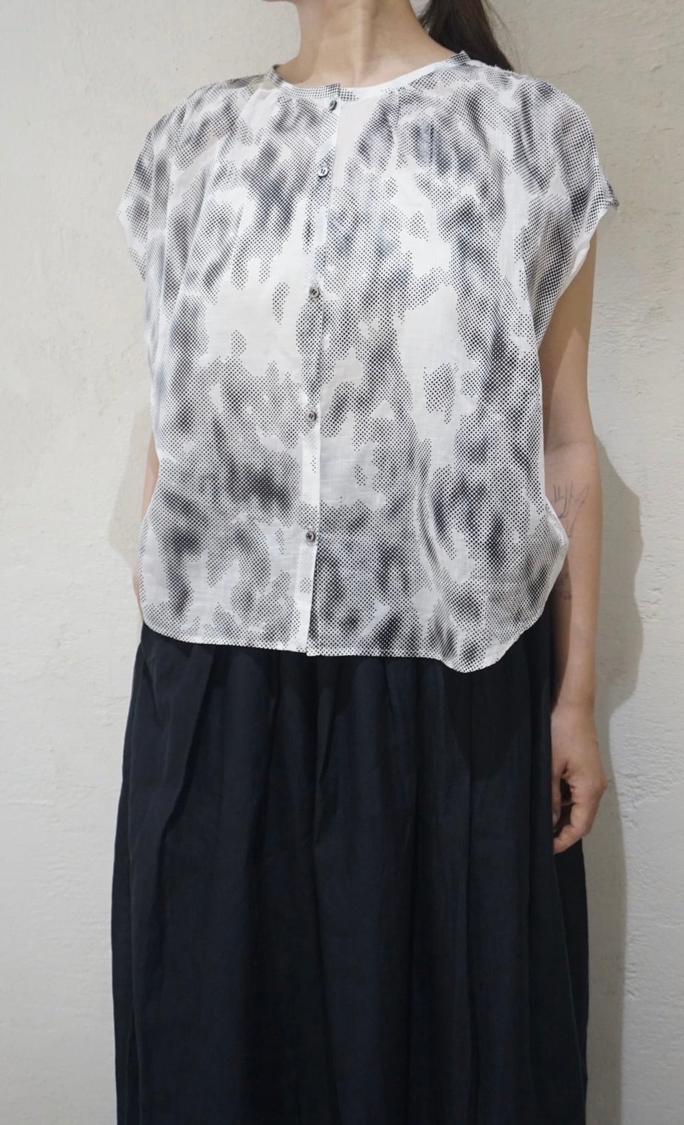 箔プリントがキラキラと反射しエレガントなブラウス。空気をまとったようなふわっと軽い着心地でじめじめとした季節でも快適に過ごせます。かっちりとタックインしたパンツスタイルや、ギャザースカートでフェミニンなスタイルまで。ぜひブラウスを主役に色々なコーディネートをしてみてください。