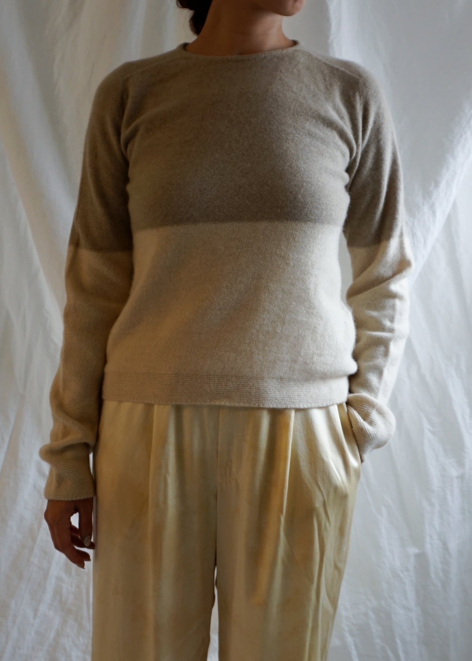 大胆に切り替えたカラーはシンプルながら一枚でも様になります。もちろんシャツやタートルとレイヤードスタイルも。アクセサリーも映えるので色々な組み合わせを楽しんでみてください。