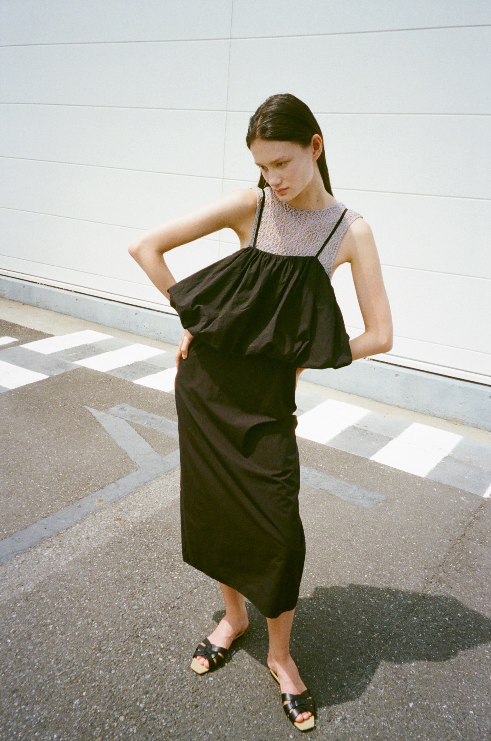 前後着用のできるデザインで、ルック撮影ではストラップデザインの空きを後ろに着用しています。