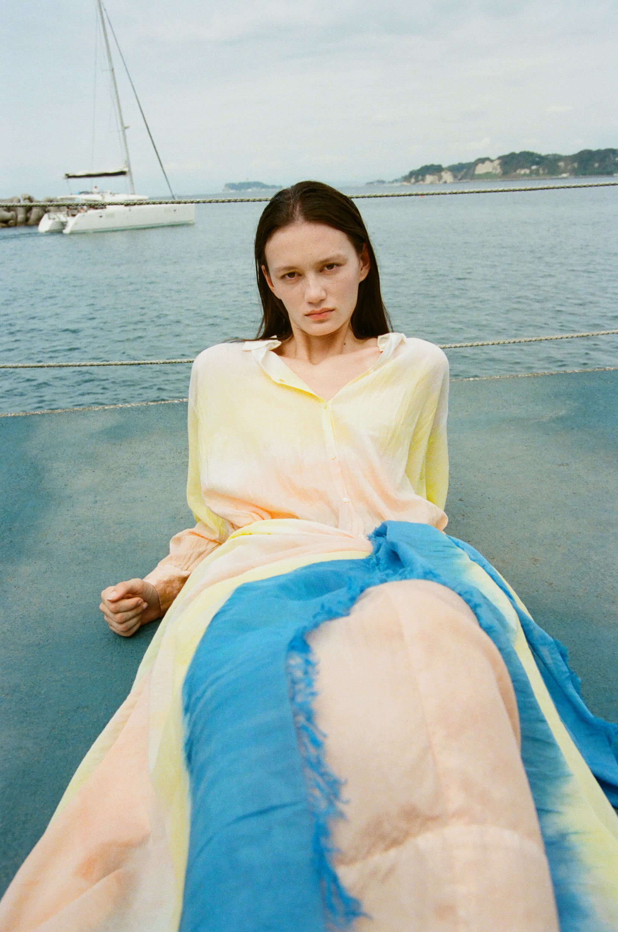 福木、マングローブ、藍の三種の染料を用い、沖縄の職人が一枚ずつ丁寧に段染めを施しています。春夏の夕暮れの空を思わせるやわらかな三色のグラデーションは、沖縄ならではの天然染料によるものです。