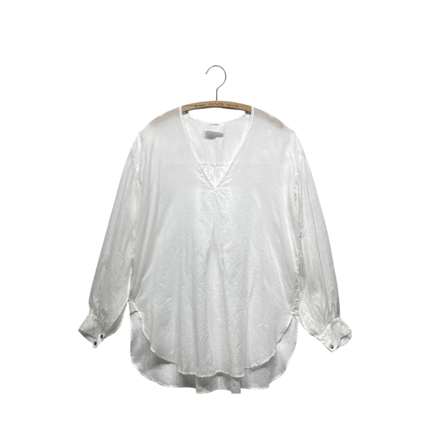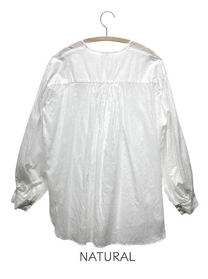 少し長めの着丈ですが薄手なので、タックインした着方もでき、ボトムのシルエット選ばず着用出来ます。