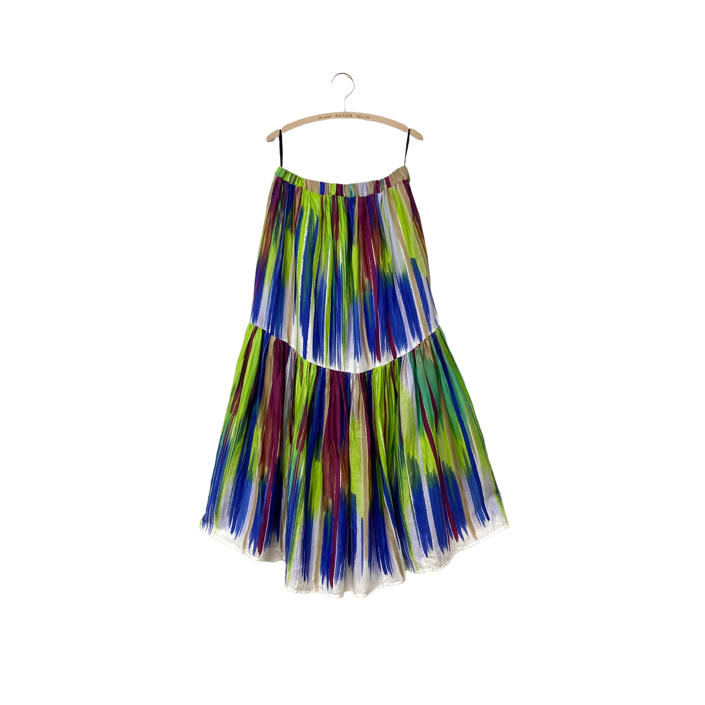 オリジナルの手書きストライプをプリントした色鮮やかな綿サテンティアードスカート。