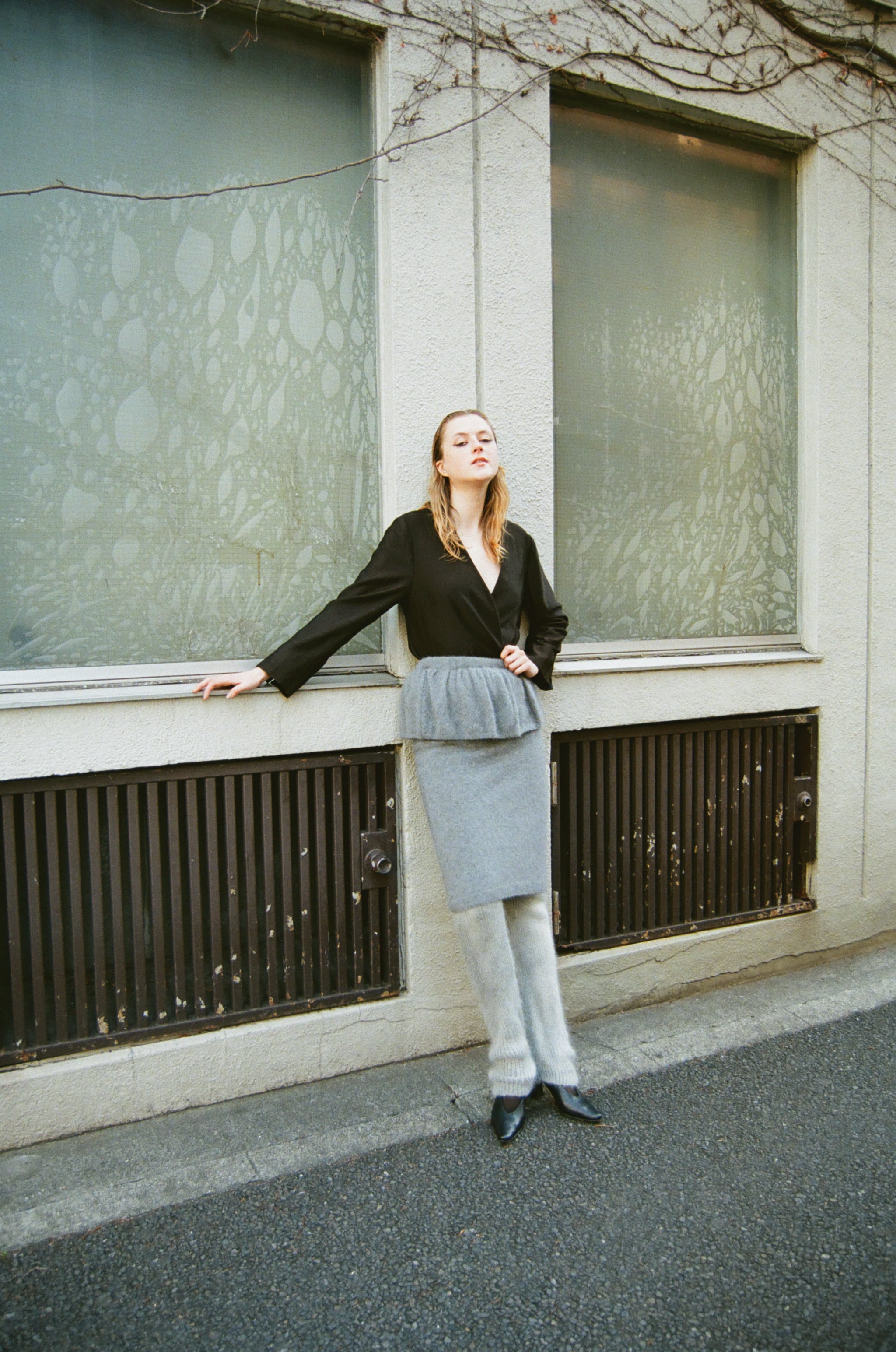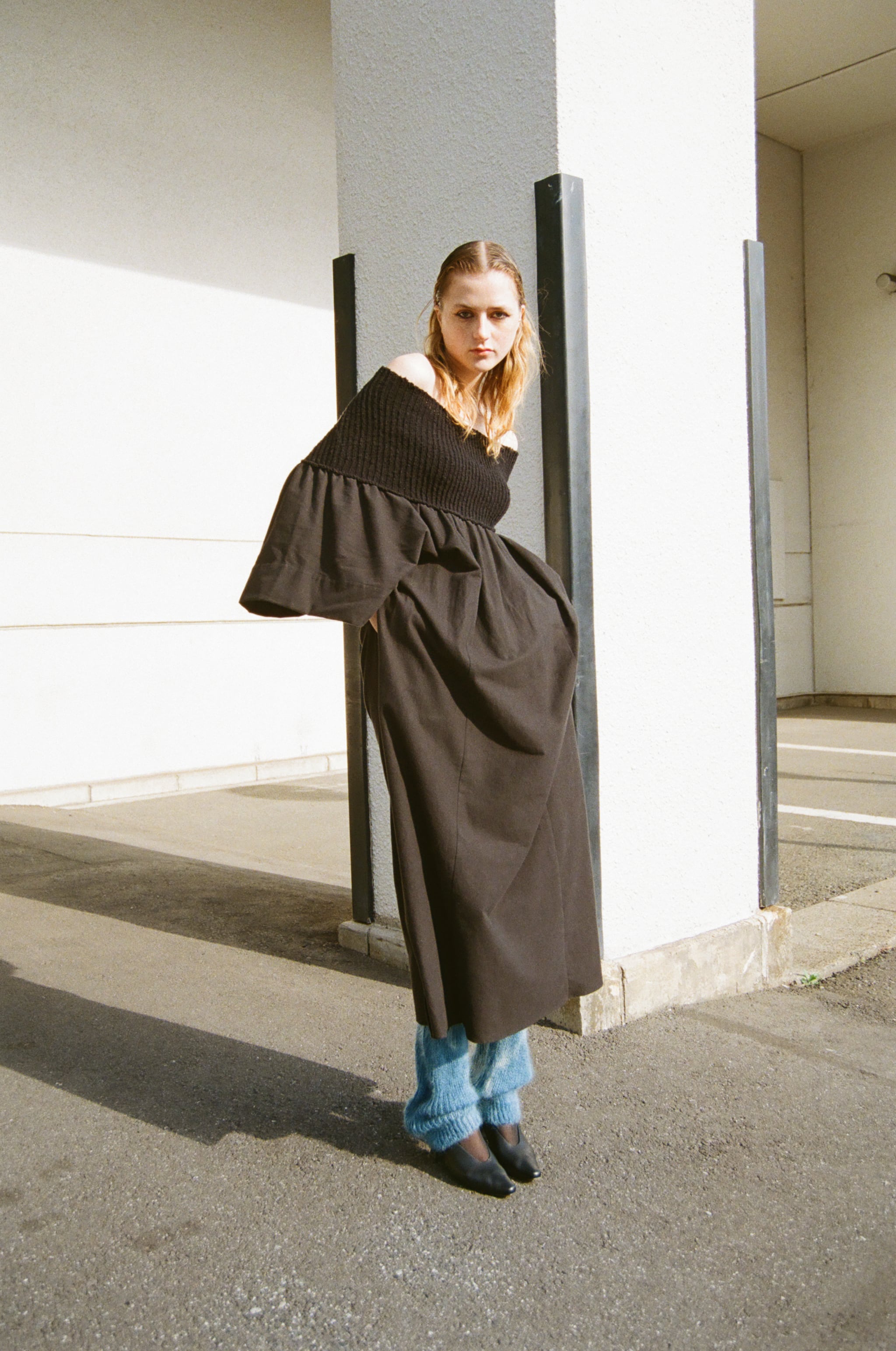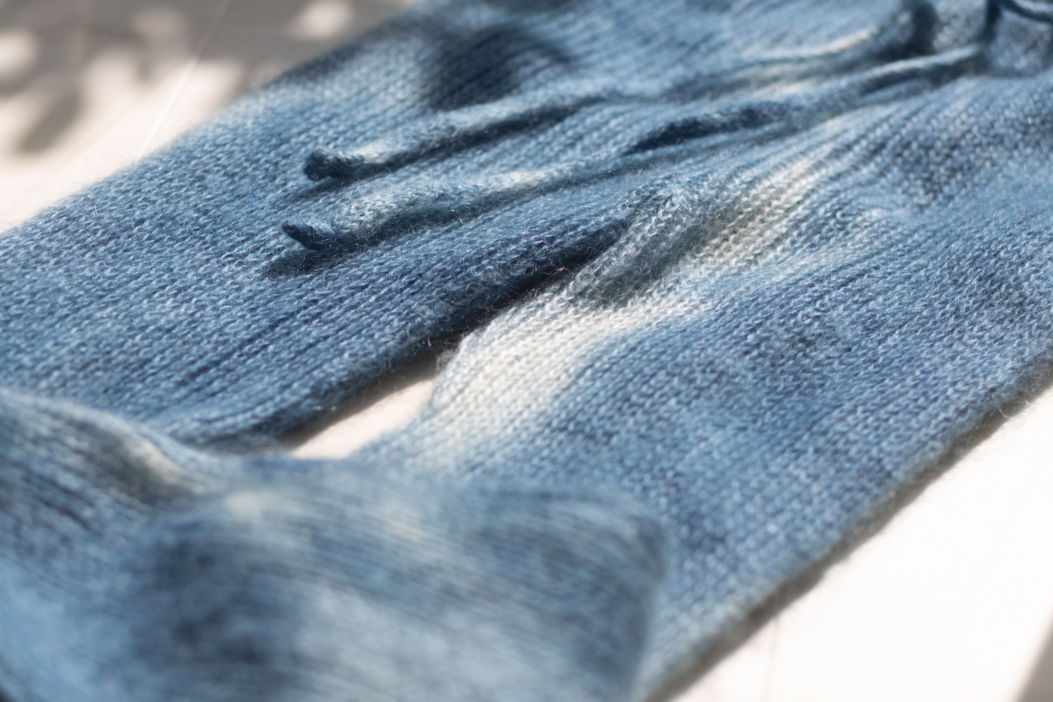 それぞれの糸で編み上がった物に炭のムラ染めを重ね、表情豊かな一着に仕上がっています。